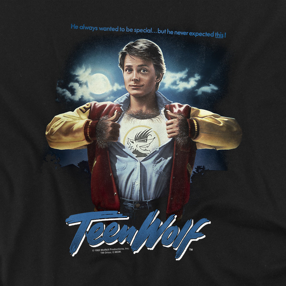 Black Teen Wolf t-shirt showing Michael J. Fox as Scott Howard pulling open his jacket and shirt to reveal a wolf logo on his chest, with a full moon and cloudy night sky in the background, and the Teen Wolf logo beneath.