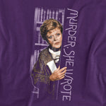 Purple t-shirt featuring Jessica Fletcher from Murder, She Wrote peeking through a doorway, with the show’s logo printed vertically.