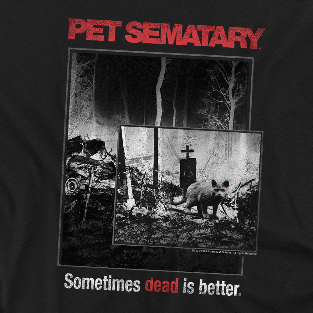 Creepy Pet Sematary t-shirt featuring the infamous tagline “Sometimes dead is better” with a graveyard scene and Church the cat.