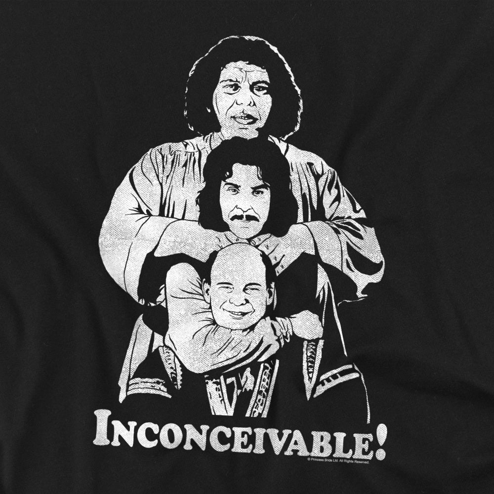 Black t-shirt with black-and-white graphic of Fezzik, Inigo, and Vizzini from The Princess Bride, stacked vertically with the word “Inconceivable!” underneath.