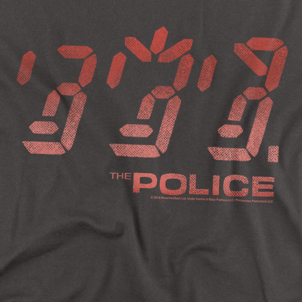 Charcoal t-shirt featuring The Police Ghost in the Machine album artwork with bold red digital-style numbers and band name below.