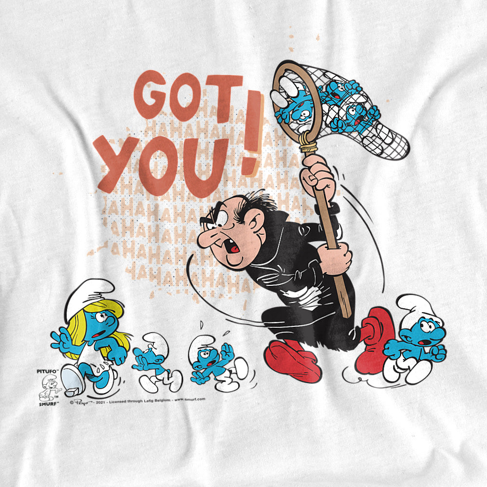 White t-shirt featuring Gargamel with a net chasing the Smurfs, with bold text reading “Got You!” above the scene.