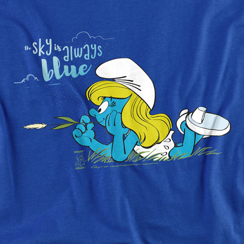 Royal blue t-shirt featuring Smurfette lying in the grass with text that reads “The sky is always blue.”