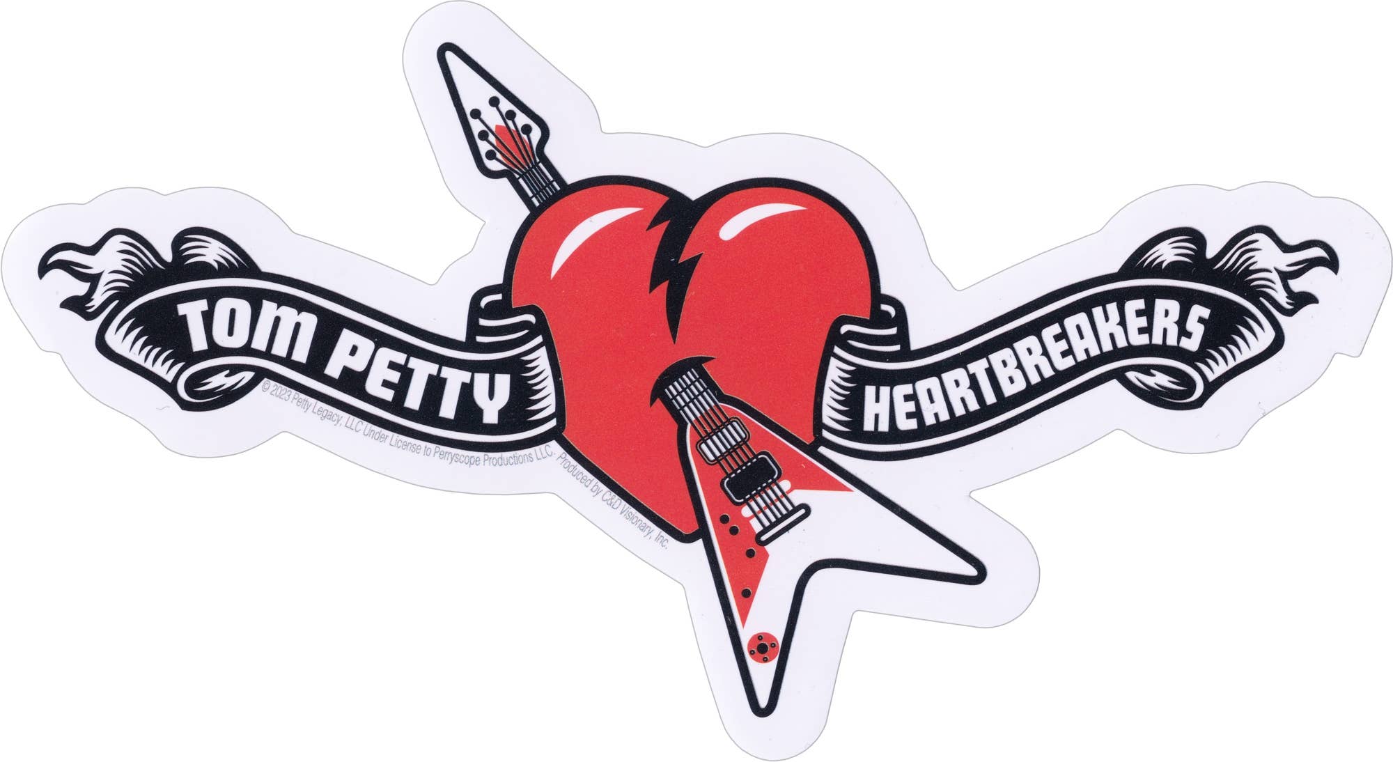 This Tom Petty And The Heartbreakers guitar through heart logo die-cut sticker measures 6 inches by 3.38 inches.
