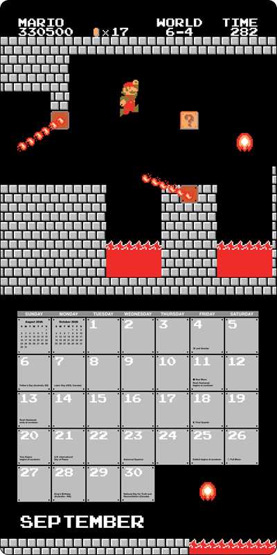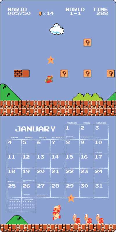 Super Mario Bros. 2026 calendar cover with classic game graphics.