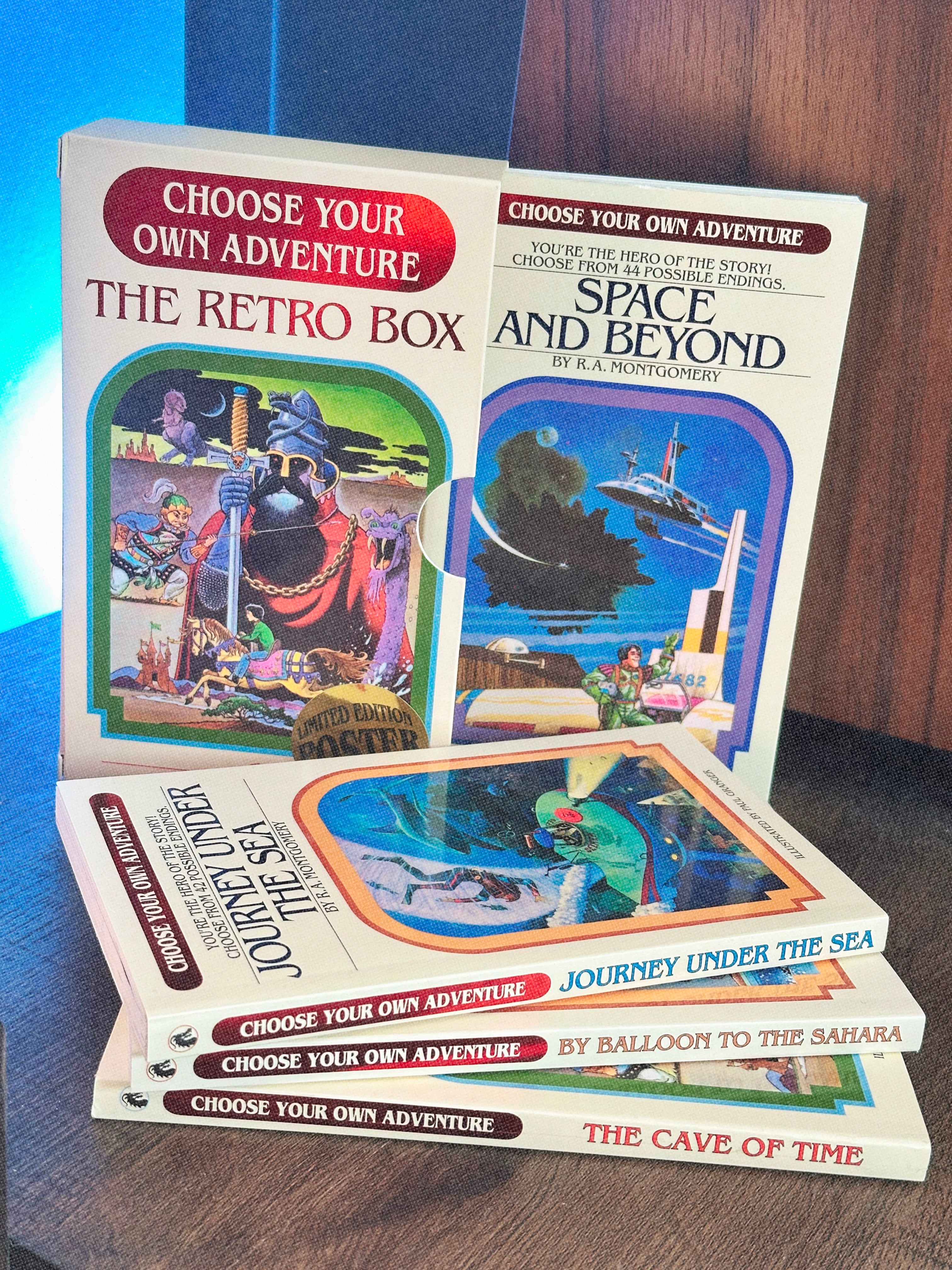 This action-packed 4-book boxed set takes YOU on over 160 adventures! Choose Your Own Adventure books–the 4th bestselling children’s series of all time–are back and as much fun as you remember. Kids and adults agree, these are the books that get 9- to 12-year-olds reading. Explore winding paths through the past and future, search for the lost city of Atlantis in your very own submarine, blast off to the furthest reaches of the galaxy, and travel by hot air balloon across the forbidding dunes of the Sahara in this 4-book set boxed together in a nostalgic 80s-era gift box. Featuring exclusive editions of most classic books in the Choose universe, The Retro Box includes: * The Cave of Time by Edward Packard * Journey Under The Sea by R. A. Montgomery * Space and Beyond by R. A. Montgomery * By Balloon to the Sahara by D. Terman * A brand new poster