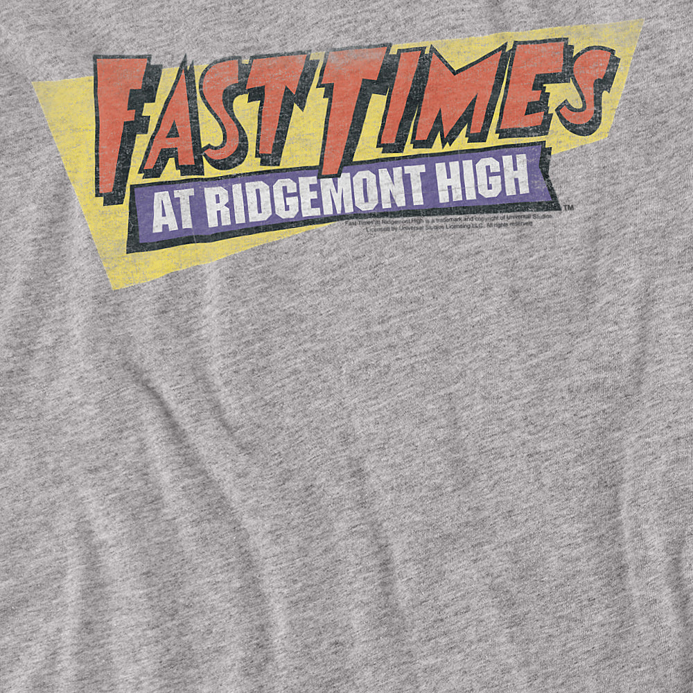 Heather gray t-shirt featuring the bold Fast Times at Ridgemont High logo in red, yellow, and purple across the chest.